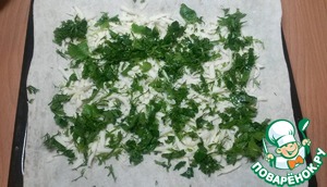Уложить на смазанный маслом противень первый лист лаваша так, чтобы он свисал сверху и снизу. Посыпать его сыром и зеленью и заварачиваем по очереди края.