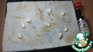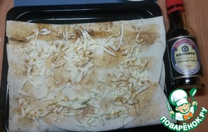 Смазать лаваш соевым соусом. Если вы хотите получить сильно хрустящие лепешки, то лучше запекать каждый лист отдельно. Я же сверху посыпаю сыром и повторяю предыдущие шаги еще с двумя листами лаваша, смазывая его соевым соусом с помощью кисточки и скрепляля их сыром.