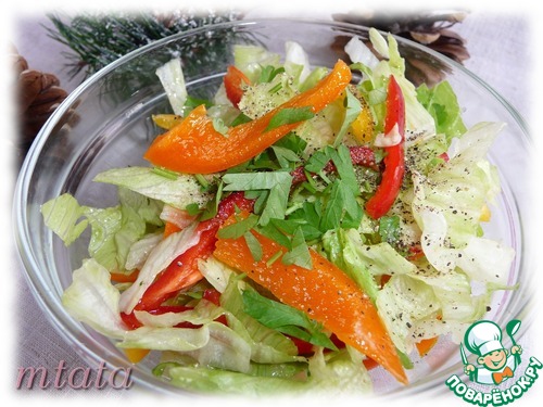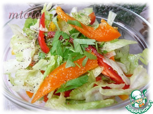 Полить салат заправкой, нарезать петрушку, поперчить, перемешать.