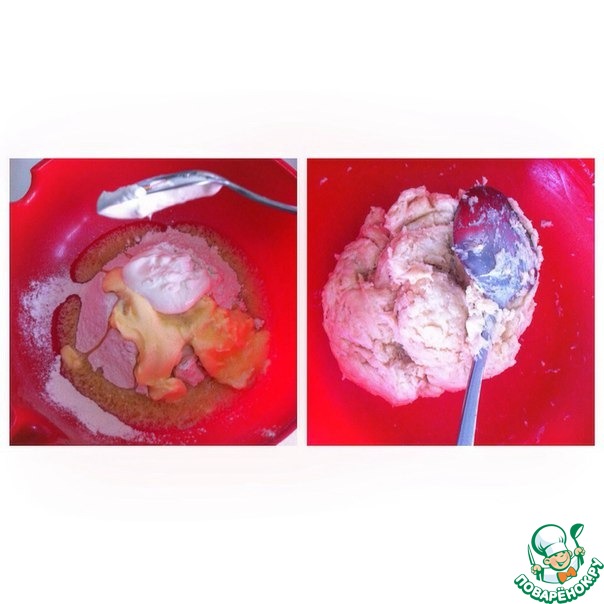 2. Соединить масло, муку с содой и сметану. Перемешать до однородности.