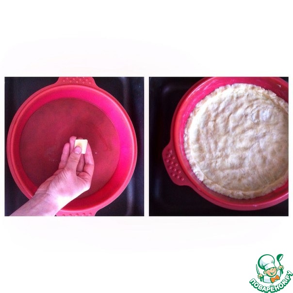 3. Взять форму и слегка смазать маслом. Тесто руками выложить в форму, сформировать бортики.