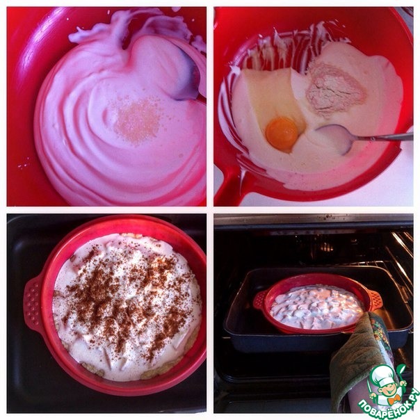 6. Приготовить крем: слегка взбить сметану с сахаром (добавляйте сахар постепенно, пробуя, а то будет очень сладко, если и яблоки сладкие), яйцом и мукой. Залить кремом яблоки и посыпать корицей.