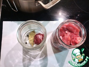 Комплектуем банки: на дно каждой 1 лавровый лист и несколько перцев, остальные горошинки и ложку соли по всему объему. Многие используют молотый перец, есть возможность поколдовать с количеством соли - больше или меньше на вкус, один из ГОСТов рекомендует небольшое количество лука, это все на усмотрение. Пользователи отмечают, что порядок закладки специй и соли произволен, в процессе готовки все перемешивается. ВАЖНО! Необходимо оставить свободное пространство между мясом и крышкой банки, не менее 1 см. Жадничать не стоит - будет жалко, если выбьет крышку и содержимое будет утрачено...