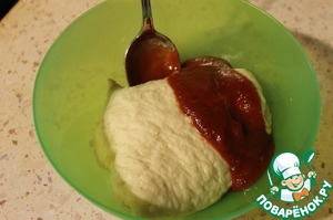 Теперь нужно отрезать 1/3 часть от томатного теста и отложить в сторону, бОльшую часть томатного теста разрезать на 8 частей.