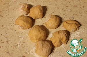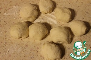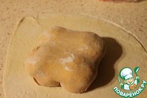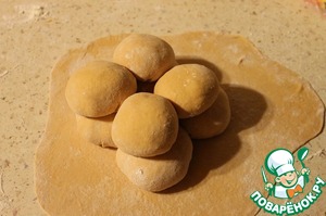 Раскатать остаток томатного теста в пласт, сложить на него подготовленные колобки теста и защипать.
