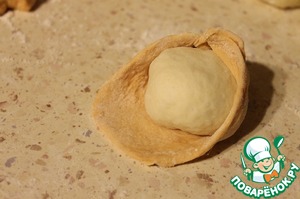Кусочки томатного теста раскатать в кружочки, сверху положить шарики из белого теста, защипать края.