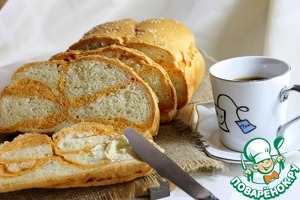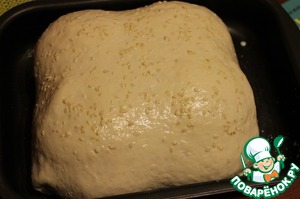 Прямоугольную форму для выпечки смазать 1 ст. л. растительного масла и положить в нее хлеб швом вниз. Накрыть чистым полотенцем и оставить на 40-60 минут. Затем смазать молоком и посыпать кунжутом.