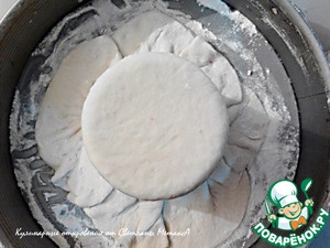 Круглую форму ( 28 см) смазываем маслом, посыпаем мукой. В центр формы ставим стакан, вверх дном. Накрываем стакан пластом из белого теста. -