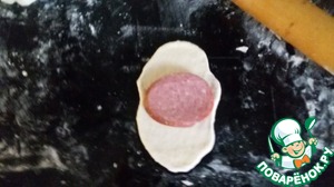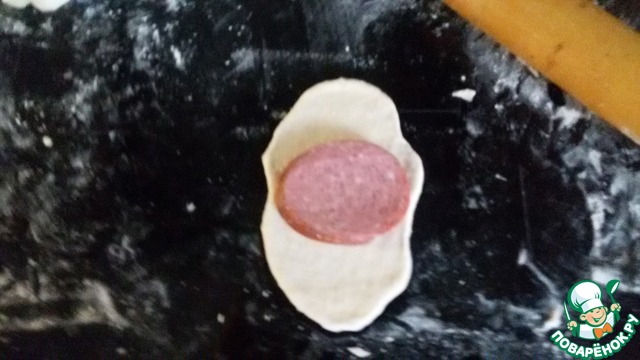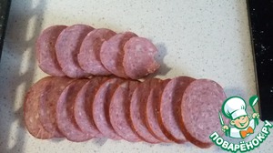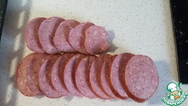 Нарезаем колбасу таким образом чтобы она была овальной формы (если вы используете вареную колбасу с большим диаметром то можно нарезать полукругом)