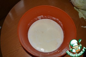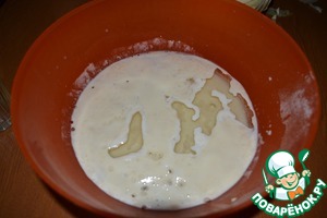 Берем 2 стакана воды и стакан молока (должны быть теплыми), 4 столовых ложки сахара, 6 столовых ложек муки, 1 столовую ложку с горкой дрожжей. Все хорошо перемешиваем и накрываем полотенцем чашку с опарой.