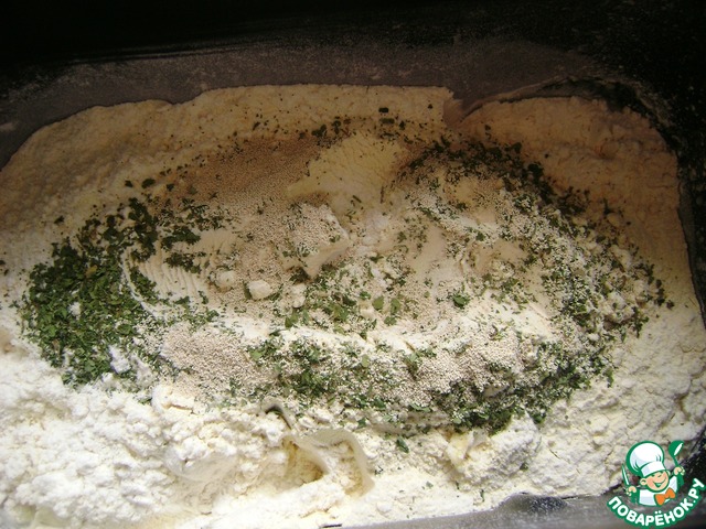 Я закладывала сразу все, но можно добавить лук и сушеные травы после сигнала к добавкам. А сушеную паприку лучше класть сразу- так она размякнет и пропитает хлеб ароматами.
