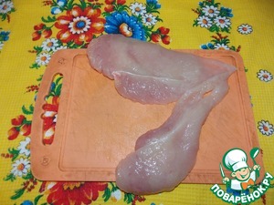 Филе промыть, обсушить бумажным полотенцем, разрезать вдоль пополам, отбить, посолить, поперчить