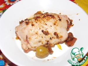 Выкладываем рулетики на противень к помидоркам. (Я к помидорам добавила оливки)Запекать в духовке. В процессе готовки пару раз полить курочку помидорным соком (если его мало, добавить воды перед тем, как ставить в духовку)