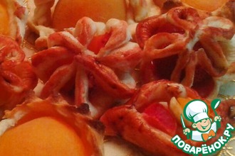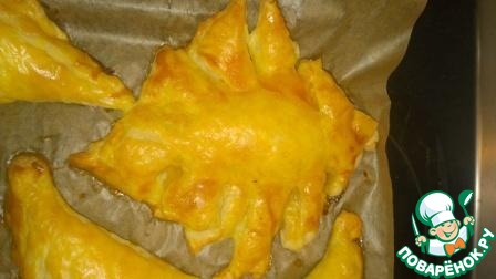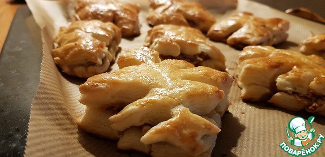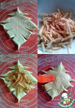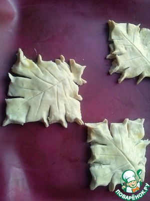 Каждый пласт теста разрезать на 6 квадратов. По каждому квадрату сделать разрезы, имитирующие разрезы листика, кончики немного оттянуть и прижать.