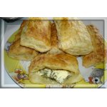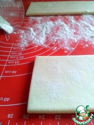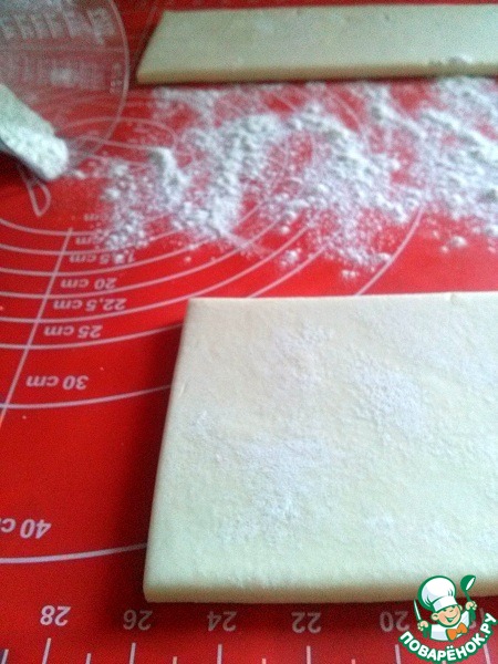 Разморозить тесто. Раскатать в одном направлении. Не старайтесь раскатывать тонко, чтобы тесто не потеряло свое свойство пушистости и слоености.