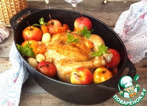 По прошествии 30 минут положите к курице целые маленькие яблоки (или крупные, разрезанные на 4 части), откройте крышку жаровни и поставьте её в духовку, чтобы слегка подпеклись яблоки и чуть заколеровалась поверхность курицы. Из готовой курицы не забудьте вынуть петрушку.