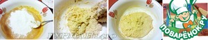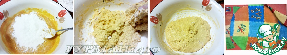 4. Постепенно вводим в эту массу просеянную муку и хорошо мешаем тесто рукой. Тесто будет сильно липнуть к рукам. Накрываем миску с тестом влажным полотенцем (смоченным в горячей воде) и отставляем в теплое место на 40 минут.