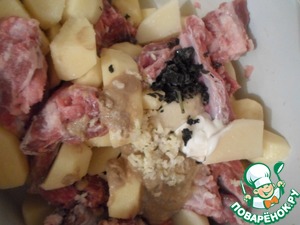 В глубокую посуду закладываем ребра и картофель. Добавляем к ним горчицу, соль, майонез, чеснок пропущенный через чеснокодавку, перец душистый, базилик. Хорошо перемешиваем.