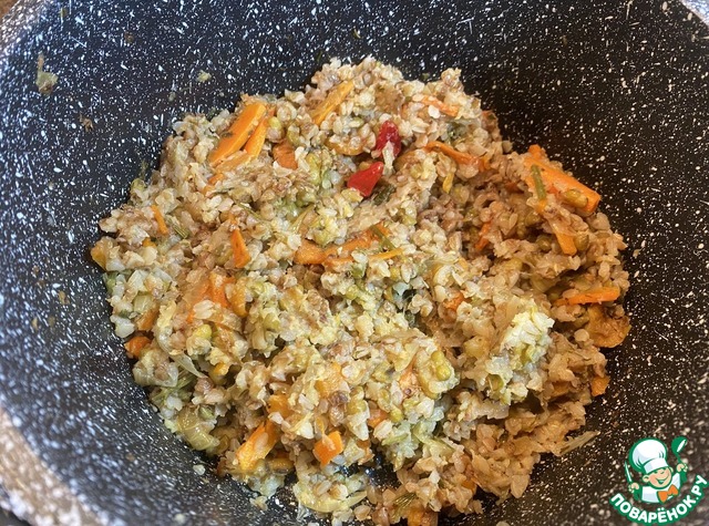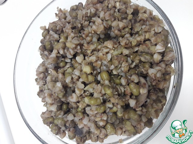 Гречку я готовлю в мультиварке. Когда я варю просто гречку, то на 1 стакан крупы беру 2 стакана воды и готовлю 20 минут на режиме «каша». Так как здесь у нас присутствует маш и овощи, то воды в гречку я вливаю 2 с половиной стакана, и готовлю 25 минут.