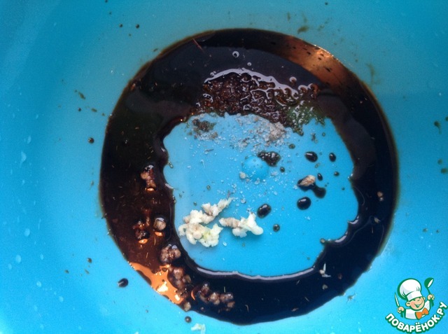 В посуду для маринования влить соевый соус, бальзамик, добавить соль, перец и чеснок, пропущенный через пресс.