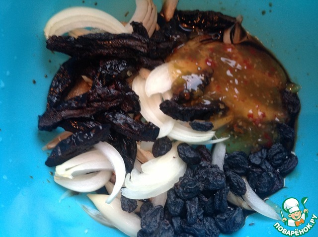 Добавить изюм и чернослив, нарезанный на полоски. Замачивать предварительно не надо. Лук нарезать полукольцами, добавить кисло-сладкий соус. Все тщательно перемешать.