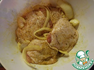 Добавляем к бёдрышкам лук. Отставим курочку в сторону, чтоб она промариновалась.