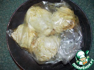 Перекладываем бёдрышки в пакет для запекания без лука (он своё дело уже сделал). Отправляем всё в духовку.