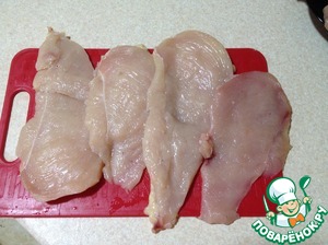 Филе куриное тщательно вымыть и порезать как на отбивные.