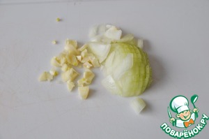 На горячую сковороду наливаем растительное масло, кладём лук и чеснок и жарим пару минут до прозрачности и аромата.