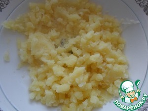 Когда картофель сварился, вытаскиваем его и разминаем вилкой или толкушкой. Кладем обратно в кастрюлю.