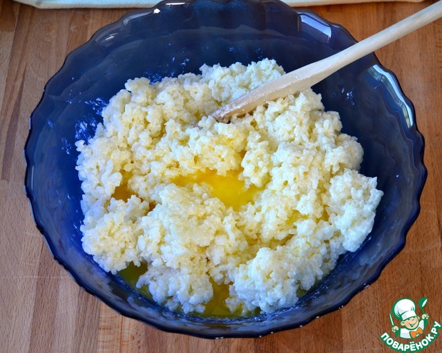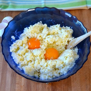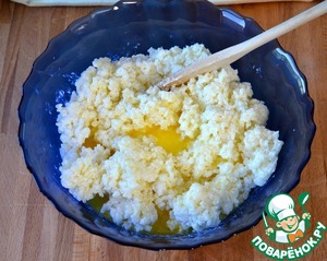Духовку разогреть до 220 градусов. Остывший рис переложить в миску. "Разбить" его вилкой (если он схватился одним куском) или ложкой и добавить растопленное сливочное масло. Как следует перемешать.