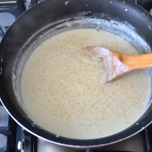 В большую кастрюлю влить молоко и довести его до кипения. Всыпать рис, немного посолить и варить на слабом огне, помешивая, пока все молоко не впитается рисом.