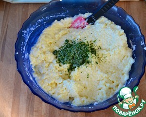 Мелко порубить ароматные травки (это могут быть любые травки по вашему вкусу... Мне очень нравится использовать свежий укроп, петрушку, тимьян...) Добавить их тоже в рис и окончательно все как следует перемешать.