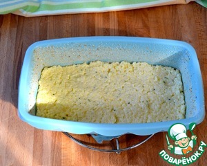 Форму для кекса смазать сливочным маслом и присыпать обильно панировочными сухарями. Далее выкладывать, чередуя, слои риса и рыбы. Здесь лучше всего сразу определиться, если у вас форма поменьше размером, то, вероятно у вас получится сделать три слоя рыбы, и тогда рис вам надо визуально поделить на 4 части. У меня форма довольно большого размера, поэтому у меня получилось 2 слоя рыбы, и 3 слоя риса, соответственно! Итак, самым нижним слоем выкладываем рис. Его важно как следует разровнять и уплотнить, помогая себе ложкой.