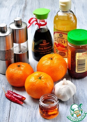 Из мандаринов выдавить сок (его должно быть граммов 400), добавить соевый соус, рисовый уксус, мед, острый соус, пропущенный через пресс чеснок, морскую соль и молотый черный перец по вкусу. Если соуса нет, можно нарезать перец.