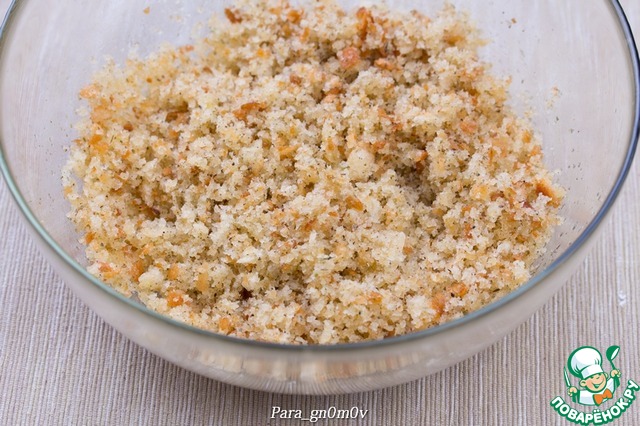 • 2. Батон (лучше вчерашний) натереть на терке. Добавить пряные травы, пропущенный через пресс чеснок, соль, перец, оливковое масло. Все тщательно перемешать. Крошки должны быть достаточно смочены. Возможно, придется добавить чуть больше масла.