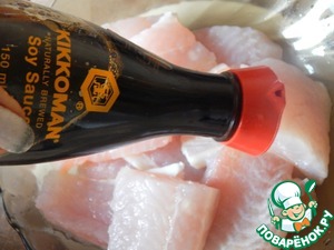 Филе режем на кусочки, соединяем со специями и заправляем соевым соусом ТМ "Киккоман". Даём помариноваться минут 15