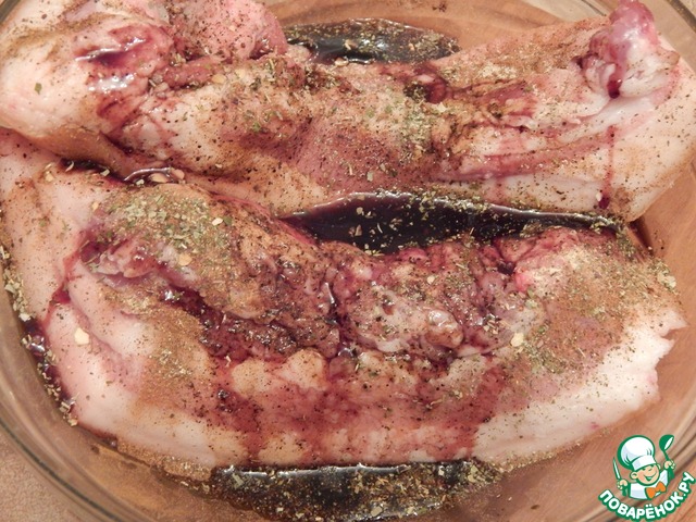 Щековину обсыпаем специями, выливаем бальзамик и соевый соус ТМ "Киккоман"