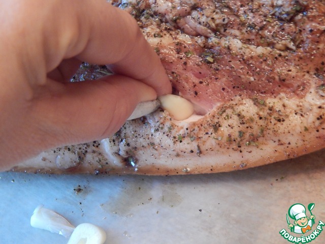 Утром нарезаем чеснок на пластинки, делаем в щековине кармашки ножом и проталкиваем в них дольки чеснока