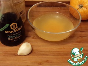 Смешайте сок и цедру апельсина с измельченным чесноком, соевым соусом "Киккоман", горчицей, вином и мускатным орехом