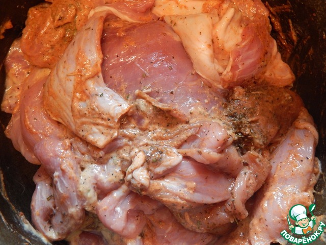 Обмазать мясо смесью специй и соевого соуса и поставить в холодильник мариноватья минимум на час (у меня маринуется ночь)