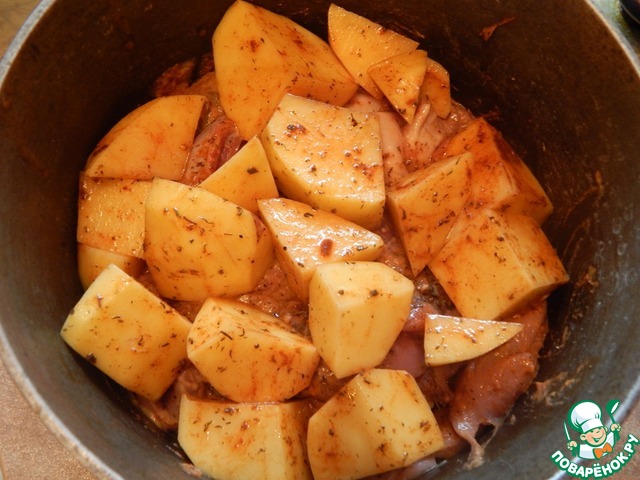 После маринования выкладываем в кастрюлю, сверху кладём нарезанный и приправленный специями картофель, вливаем воду