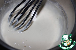 Яйцо взбиваем венчиком. Добавляем щепотку соли, молоко и муку. Все перемешиваем до однородной массы. Тесто должно получиться как густая сметана.