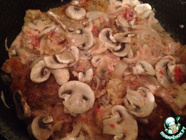 Второй шаг. Пока наши отбивные жарятся, нарезаем лук и шампиньоны, добавляем так же в жарку к говядине