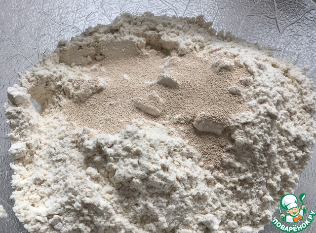 Просейте муку, всыпьте миндальную крошку, добавьте сухие дрожжи и соль.