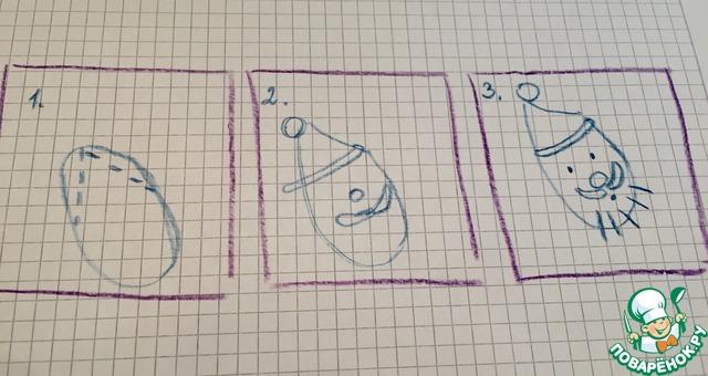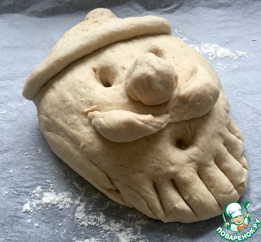Формируем из теста овал. Отрезаем сверху 2 части. Из них мы сделаем: усы, нос, помпон и оконтовочку на шапочке!