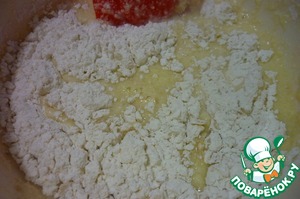 Влить яблочный отвар в масляную смесь, перемешать и частями ввести сухие ингредиенты.