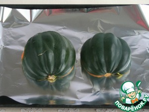 Акорн (тыкву) разрезать пополам, посолить, выложить на лист разрезом вниз. Запекать 40 минут при 200 С