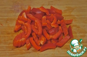Перец разрезать вдоль на 6 частей и затем поперек на полоски.