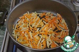 Морковь и корневой сельдерей спассеровать на растительном масле.